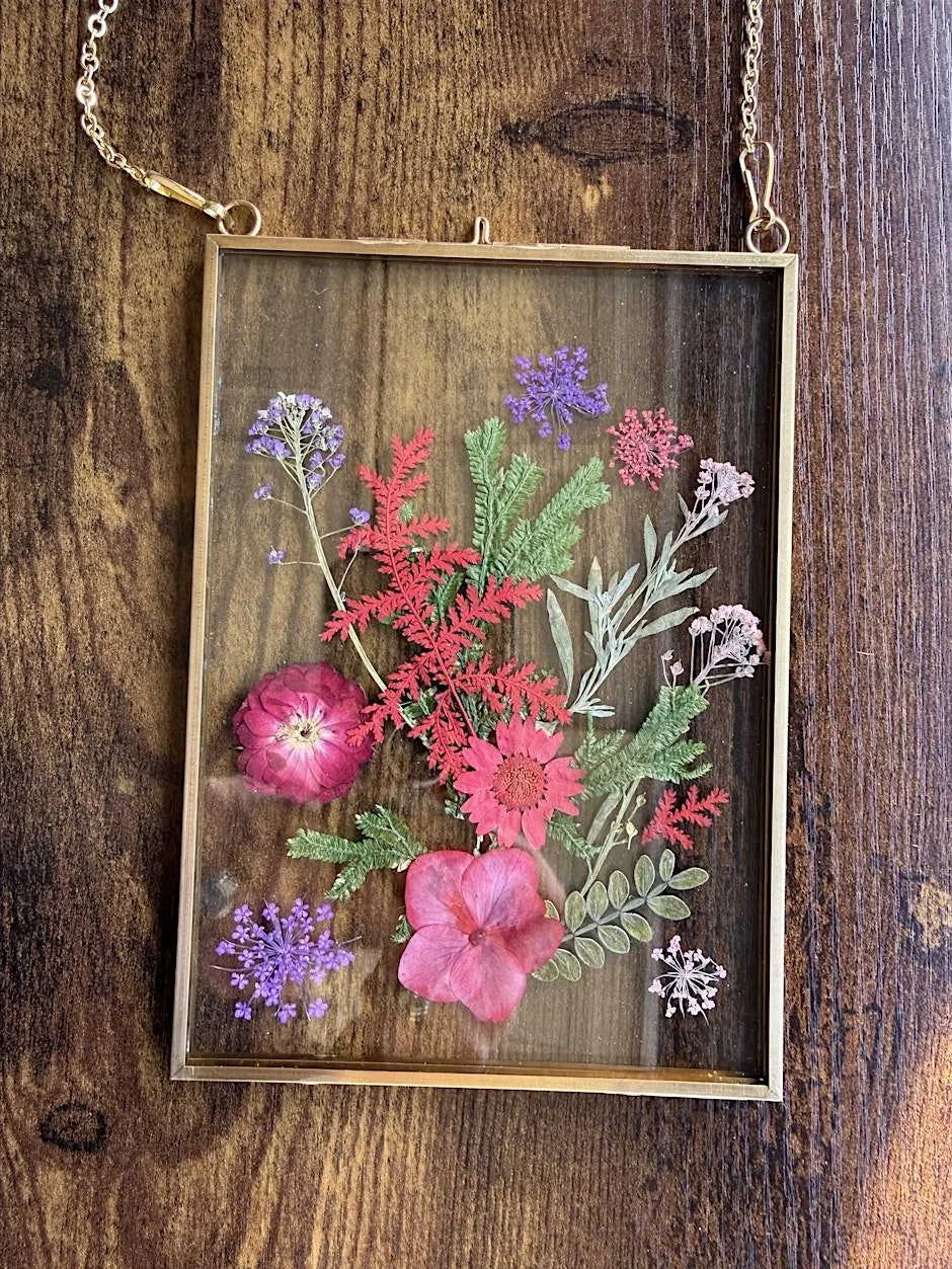 Come let your creativity flow with these delicate hanging gold frames filled with pressed flowers. Each piece brings a warm, natural touch and catches light beautifully—perfect for brightening any room, porch, or workspace. Simple to hang and welcoming to every style, they make thoughtful gifts or a serene addition to your own space. All are welcome. Grab your girlfriends and come create with us.